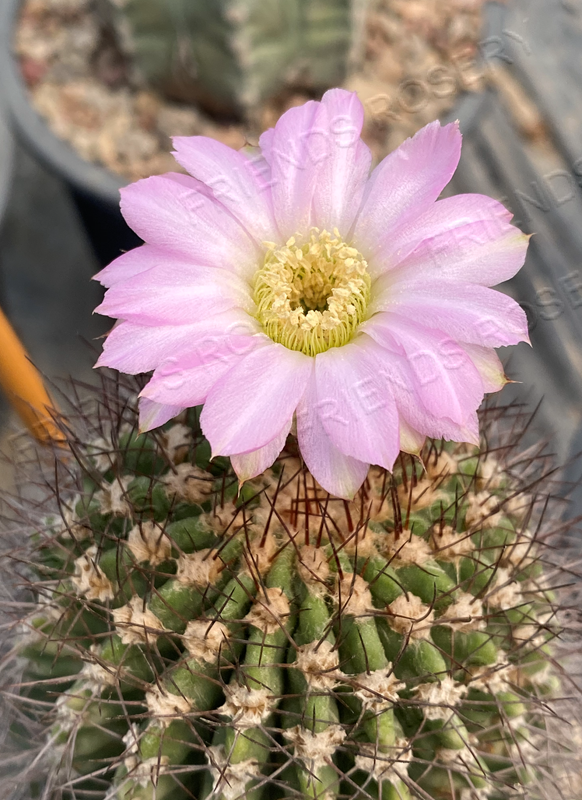 Globular cactus having long curved spines on deep green body. Mostly solitary body. Blooms are violet pinkish coloured in summers.