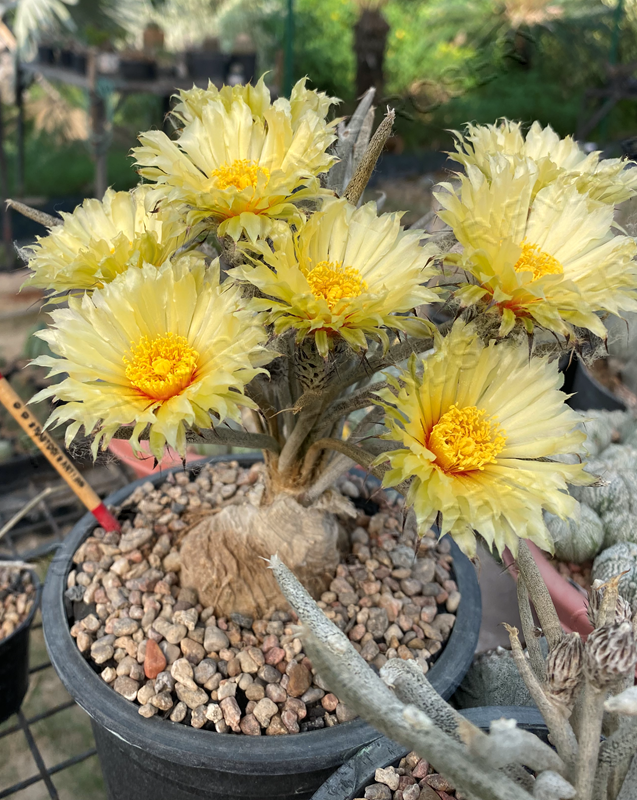 A new addition to Astrophytum genera. Finger like tubercles arise from a caudex forming cactii. Blooms are yellow with reddish ring in the center. Blooms occur April onwards.