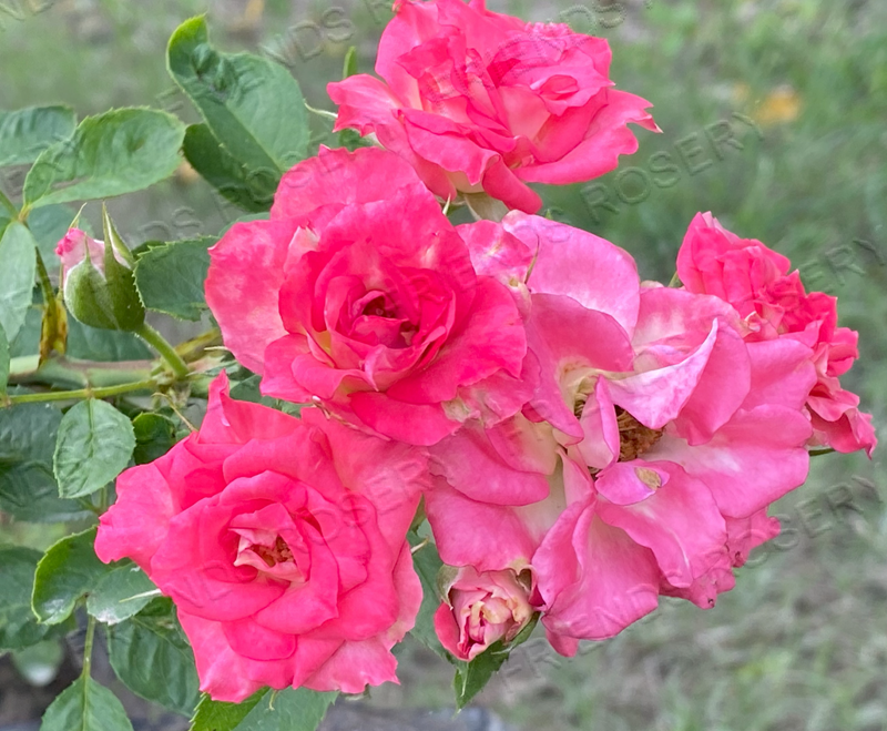 Medium sized blooms of carmine red edged on a creamy white base. Blooms are in cluster.