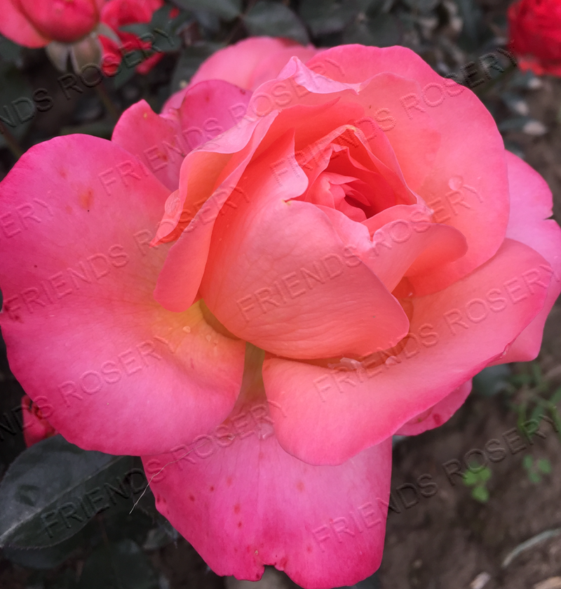 Beautifiul bicolour, blend of orange and pink, good shape and size on a vigorous plant having bold green foliage.
