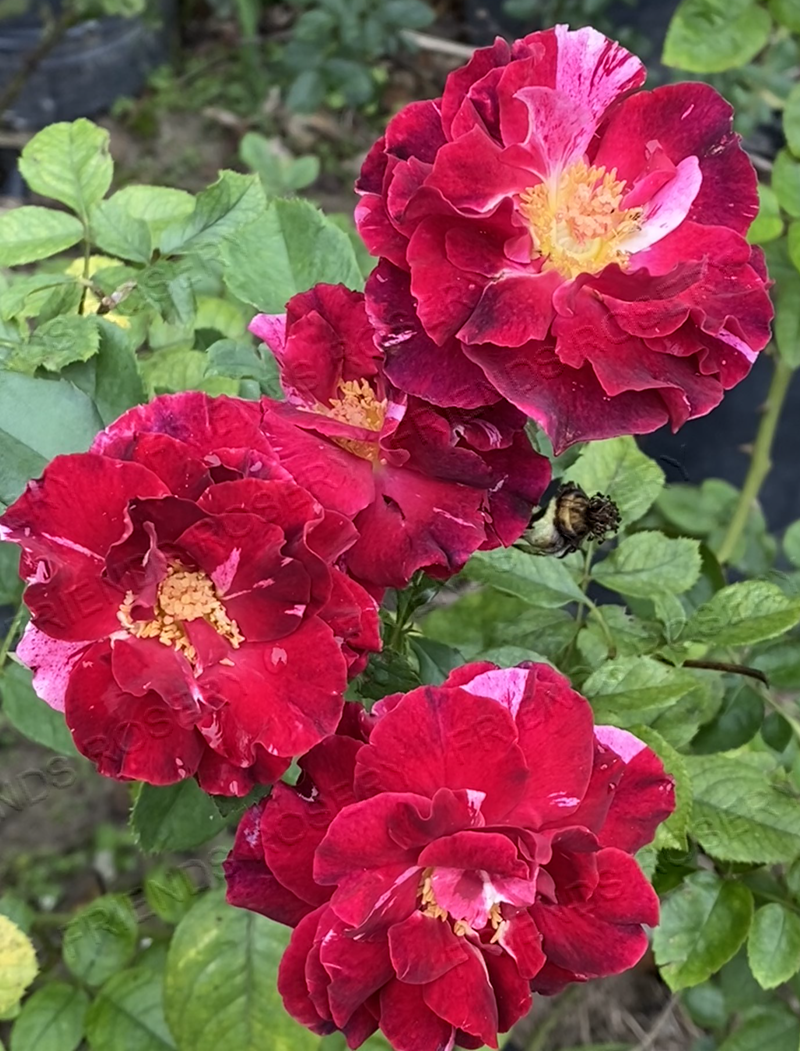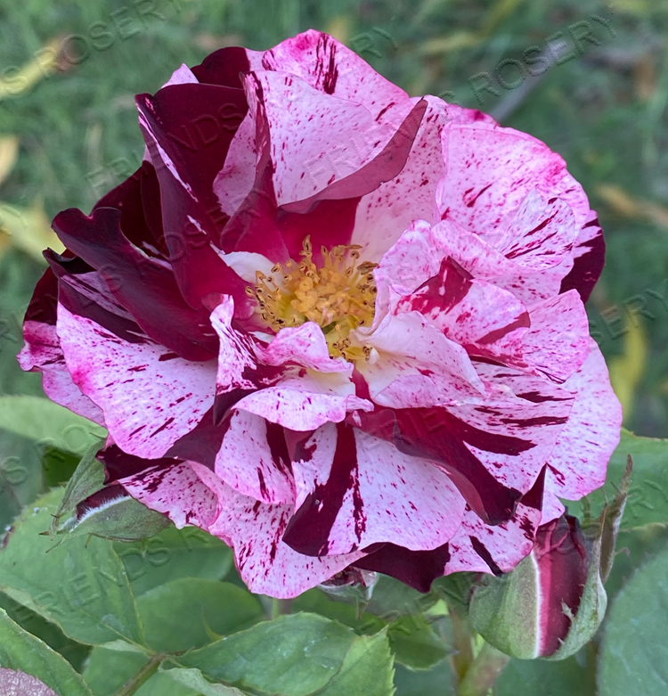 Clusters of purple white stripes are produced on long arching canes. Blooms are double and medium sized. Upright plant.