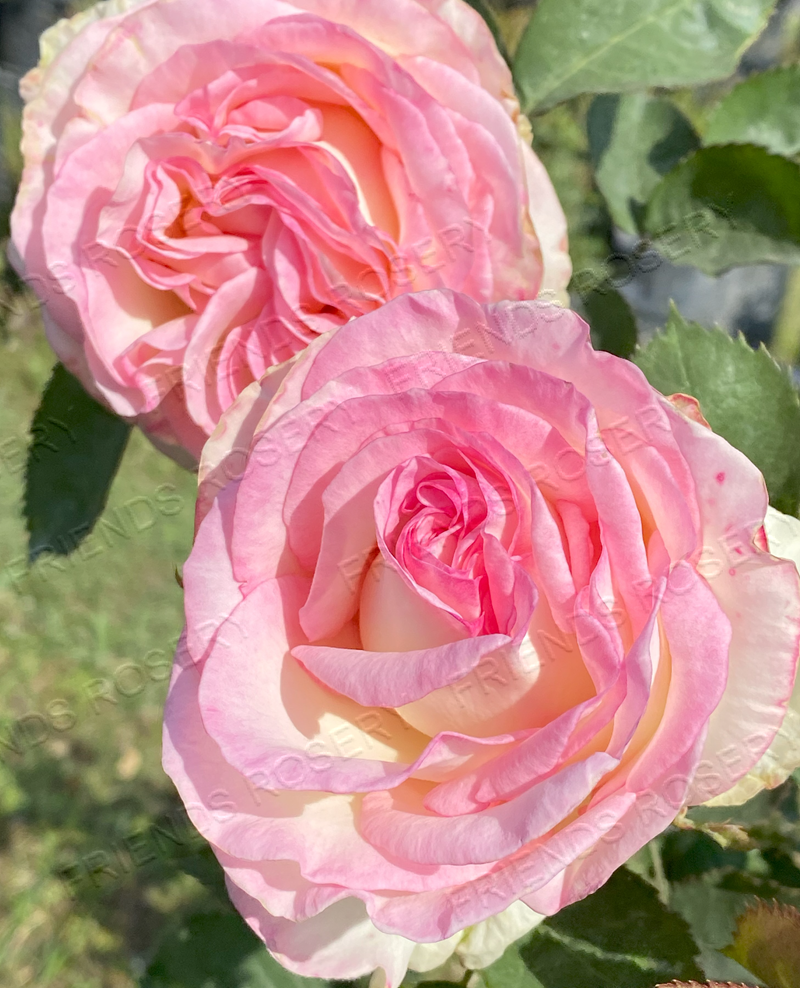 Very large clear white with delicate pink edges blooms of large size on a leathery dark green foliage on an upright plant.