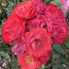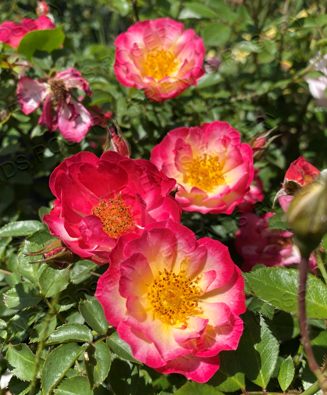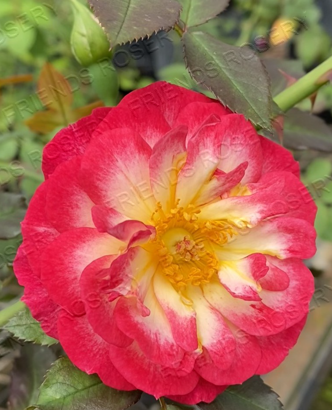 Beautiful semi double flowers of white with red broad edged blooms. Blooms are in cluster on low growing plant and arching canes. Ideal for pots, hedging & hanging baskets.