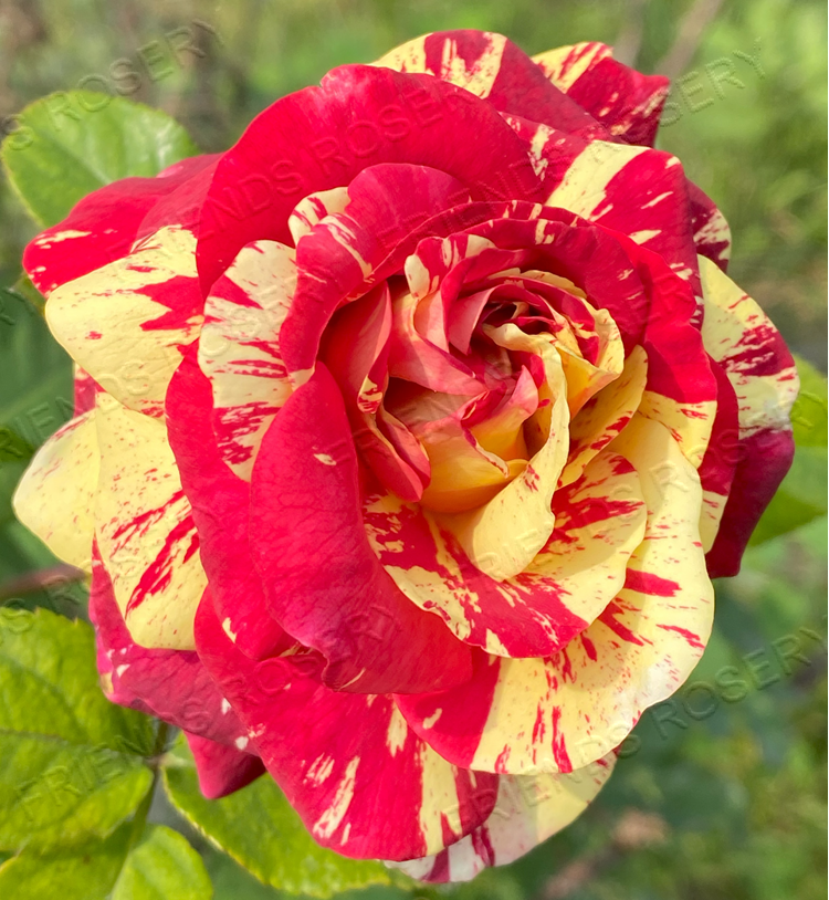 Double blooms of red with white or yellow stripes on bushy upright plant having glossy dark foliage.